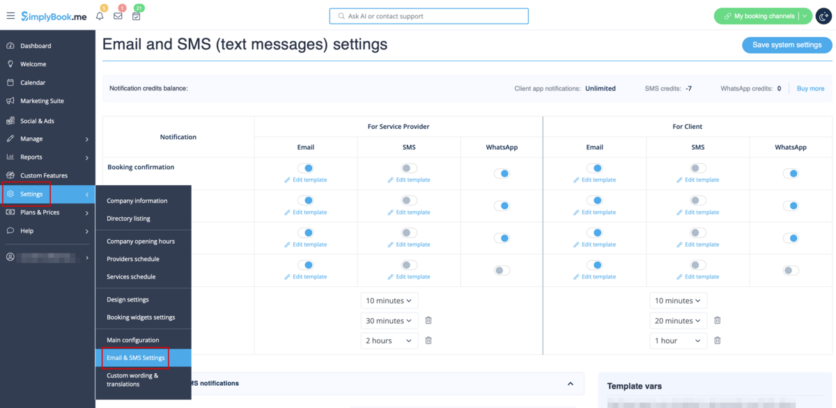 Go to <span style="background-color:#d4f8e5; padding:5px; border-radius:5px;">Settings</span> -> <span style="background-color:#d4f8e5; padding:5px; border-radius:5px;">Email and SMS settings</span> and <span style="background-color:#d4f8e5; padding:5px; border-radius:5px;">check/uncheck</span> the corresponding boxes to send/not send notifications. You can change the texts of notifications to better suit your needs by clicking <span style="background-color:#d4f8e5; padding:5px; border-radius:5px;">edit template,</span> making changes and saving system settings.<br> | |||