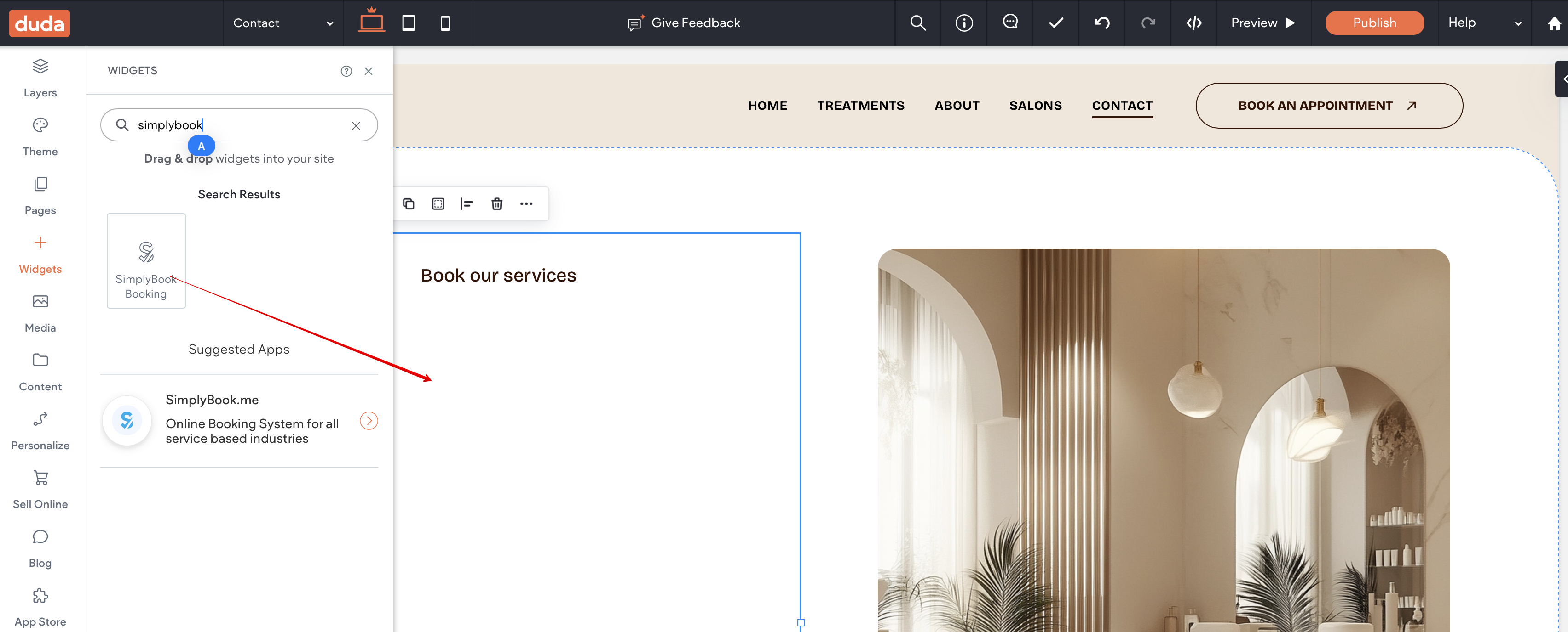 7. Click on Widgets again and select the 'Simplybook booking to drag it to the page.
